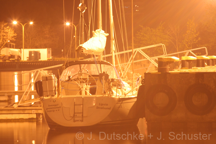 Lipsia…auch im Mai. So war es zumindest gefühlt für uns. Wir… sind Jan Schuster, Jürgen Dutschke und Jörg Zinn, die sich am 6.5.2010 aufmachten, um einen Aufbautörn der Seesegler Leipzig zu absolvieren. Fast komplett lag die „LIPSIA“ dank der Vorarbeit von den Mannen um Manfred Weißbach schon am Steg. Nach weiteren kleinen Vorbereitungen am Boot ging es dann von Greifswald, dem Winterlager, über Peenestrom (Peenemünde),  Stettiner Haff (Mönkenbude), Swinemünde, den Ruden, Lohme, Glowe, Vitte zum Sommerliegeplatz auf dem Dänholm nach Stralsund. Wassertemperaturen von bis zu 6° und Lufttemperaturen von höchstens 12° sorgten kaum für Frühlingsgefühle. Sicher hätte mancher Törn zu Weihnachten oder auch in den Winterferien bessere Temperaturen gehabt. Auch die fast 3h Sonne innerhalb von 10 Tagen sorgten kaum für eine Erwärmung, dafür musste die Dieselheizung und die eine oder andere Flasche Hochprozentiges herhalten. Neuigkeiten gibts auch von der Küste. Der Ruden wurde an die DBU verkauft. Fest steht, dass der Badestrand bereits jetzt geschlossen wird. Was mit dem Hafen wird, steht in den Sternen.
