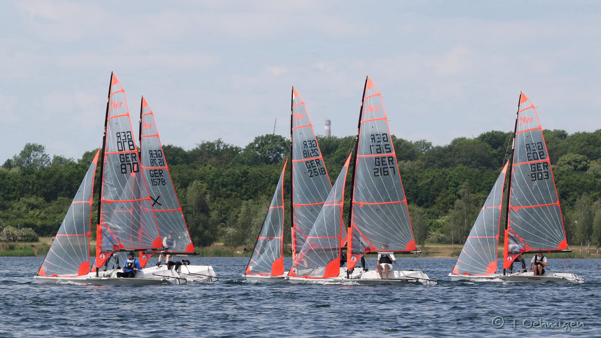 Die 29er absolvierten am Samstag bereits fünf Wettfahrten, die anderen Klassen segelten drei bis vier Wettfahrten. Nachdem alle Segler wieder im Hafen waren, konnte man sich am Grill mit Burgern und allerlei Fleisch den Bauch vollschlagen. Gemütlich ließen die Segler den Abend ausklingen, allerdings entdeckten sie am Sonntag zunächst nur eines: Flaute – der See ein einziger Spiegel.